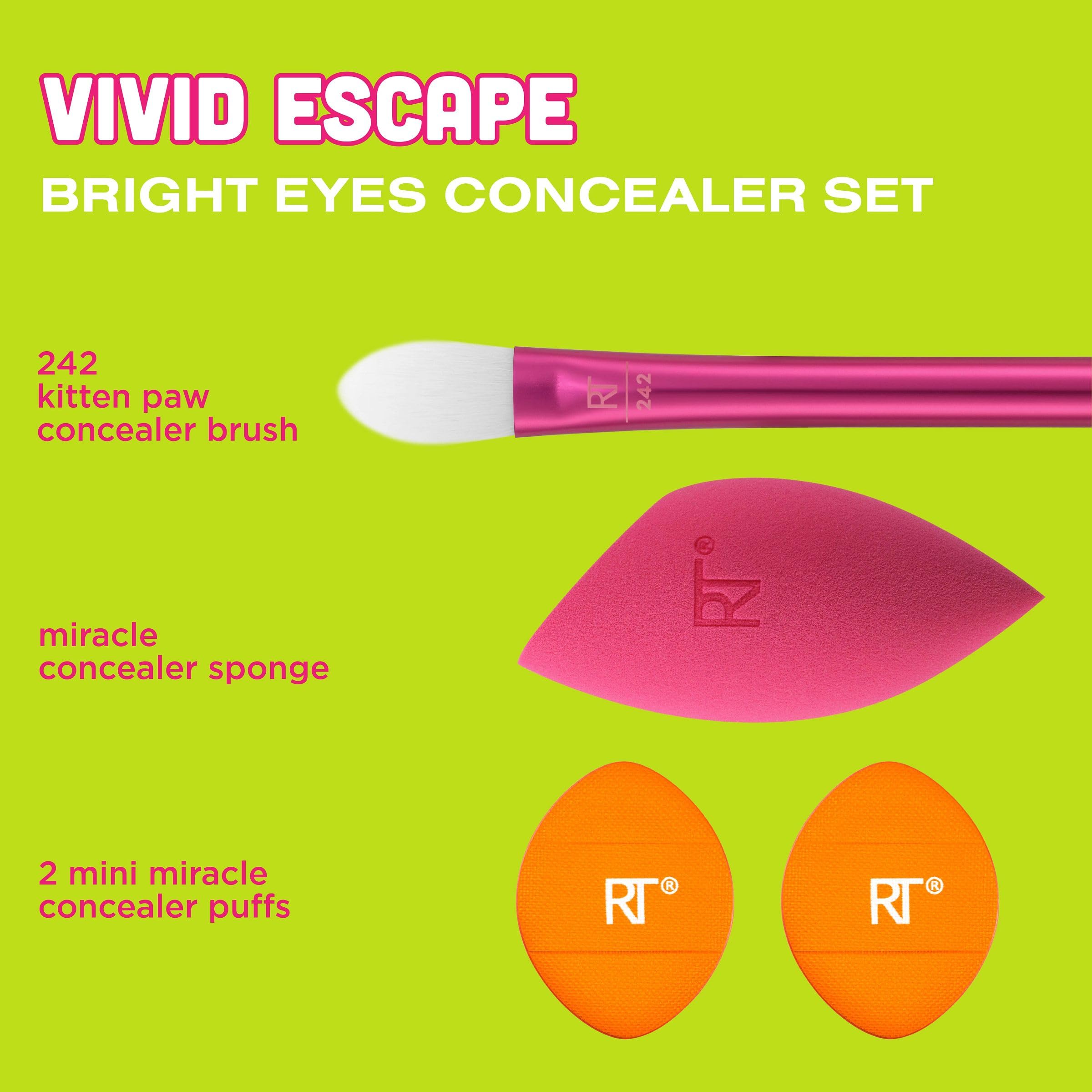 - Real Techniques Vivid Escape Bright Eyes Concealer Set includes: (1) RT 242 Kitten Paw Concealer Brush, (1) Miracle Concealer Sponge, and (2) Mini Miracle Concealer Puffs for building targeted coverage with liquid and cream concealer