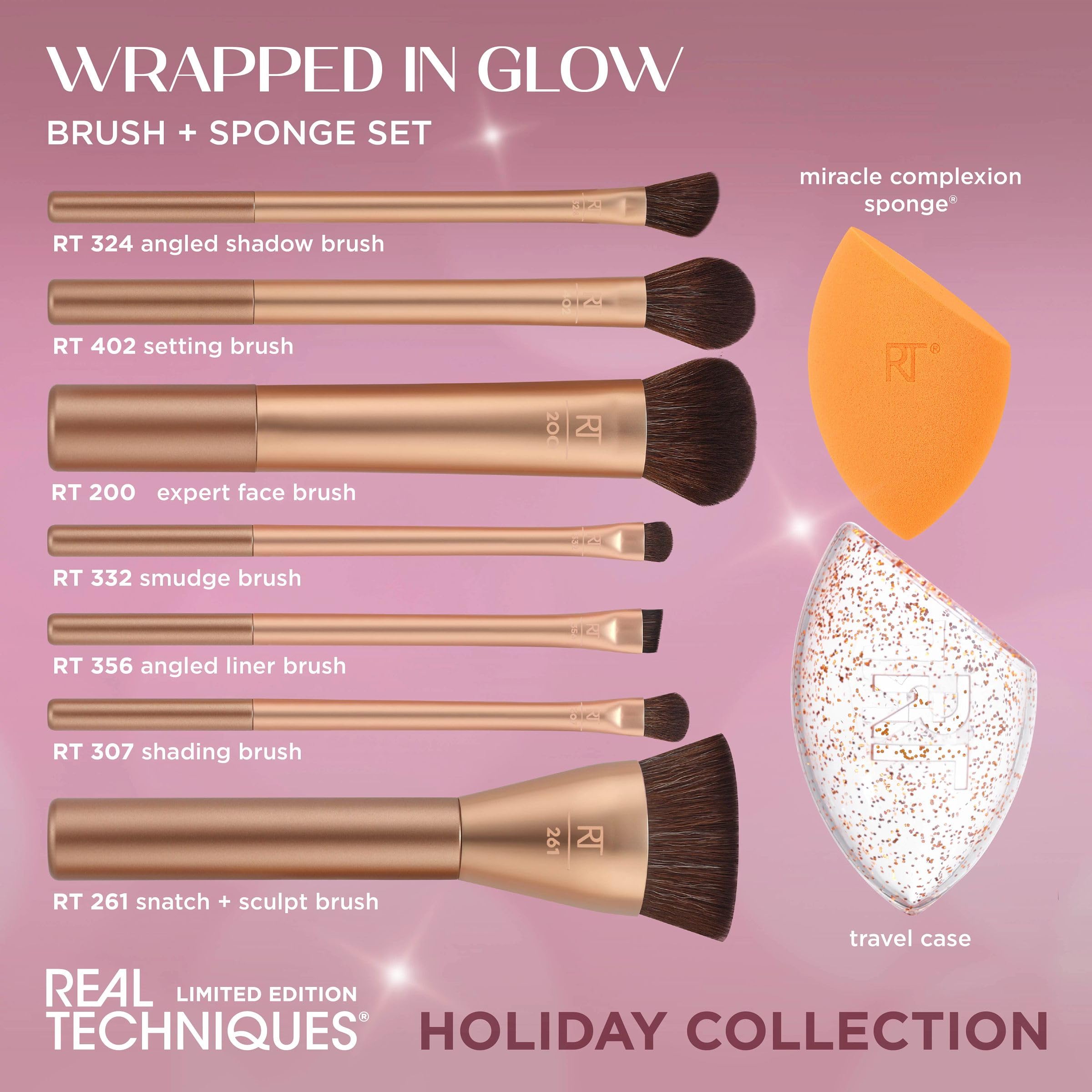 - Real Techniques Wrapped In Glow Gift Set Includes: 402 Setting Brush, 200 Expert Face Brush, 261 Snatch + Sculpt Brush, 324 Angled Shadow Brush, 332 Smudge Brush, 356 Angled Liner Brush, 307 Shading Brush, Miracle Complexion Sponge, & Sponge Case